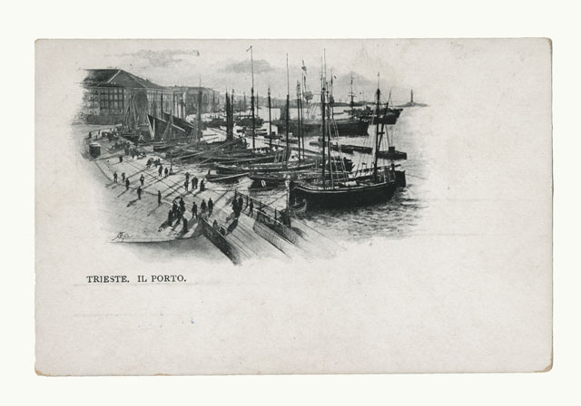 Alcune delle cartoline più antiche conservate in Fototeca (utilizzate in viaggio e non) propongono il tema del porto in forma di veduta con elementi decorativi, spesso floreali, affiancati dalla dicitura “Saluti da Trieste”. Il modello riprende lo stile dei Gruss tedeschi, con una struttura compositiva che contempla la piccola veduta racchiusa in cammei per lasciare lo spazio al messaggio, sul recto in basso a destra, in modo da non sporcare l'immagine. Il verso è originariamente destinato solo all'indirizzo e al francobollo. Testo tratto dal saggio: "Vedute e visioni di Porto Vecchio"