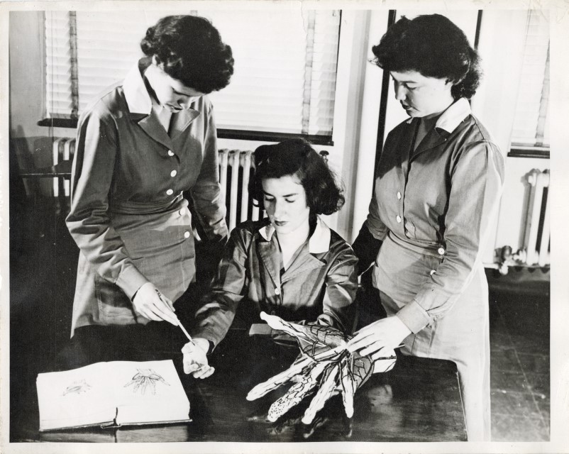 Studentesse americane studiano l'anatomia della mano servendosi di un modello e di una pubblicazione