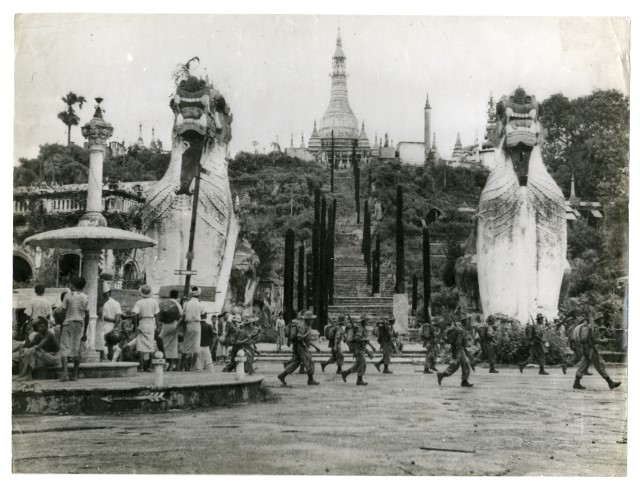 I soldati inglesi entrano vittoriosi a Prome, nei pressi del tempio protetto dalle statue dei Chinthe, creature mitologiche simili al leone.