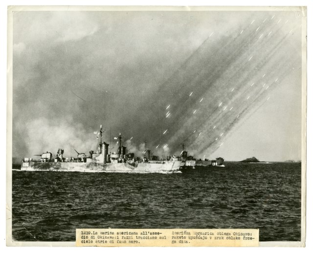 Lancio di razzi americani contro navi giapponesi durante la battaglia di Okinawa.
