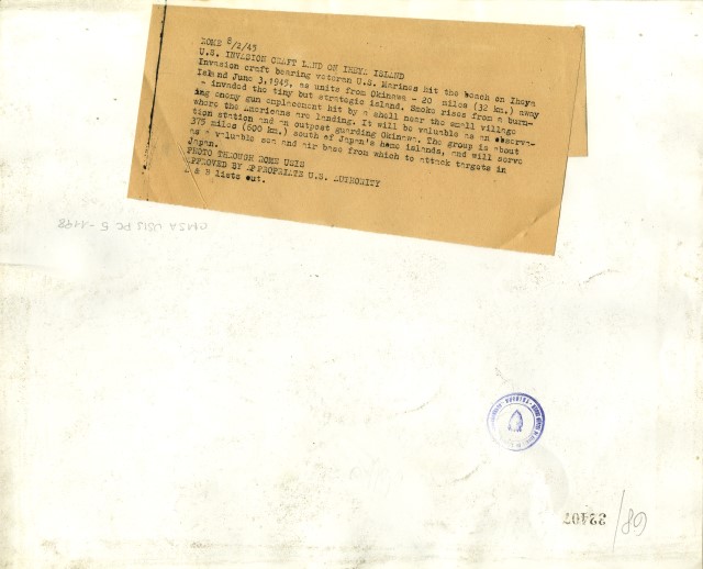 La flotta della Marina americana sta per sbarcare su Iheya, una piccola isola dell'arcipelago di Ryukyu. La veduta aerea mostra, inoltre, l'incendio di una postazione di artiglieria giapponese a seguito di un bombardamento americano.
