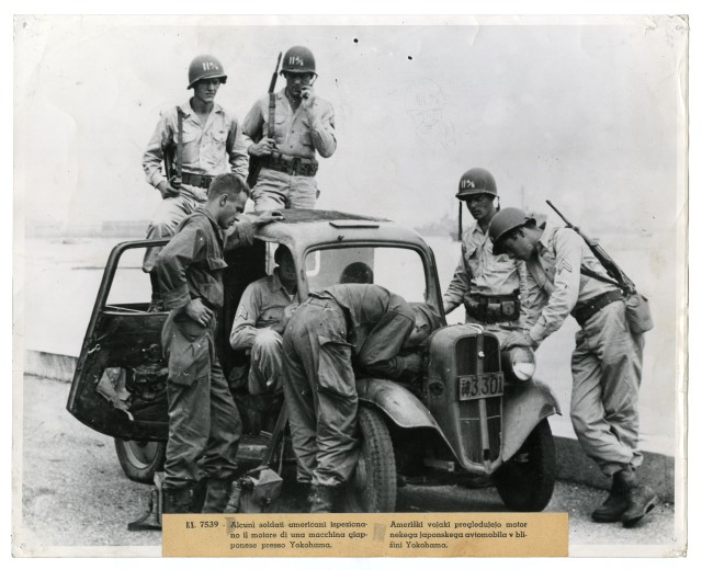 Una truppa americana dell'undicesima divisione aerea ispeziona il motore di un'automobile giappponese nella città di portuale di Yokohama, invasa il 29 agosto 1945.