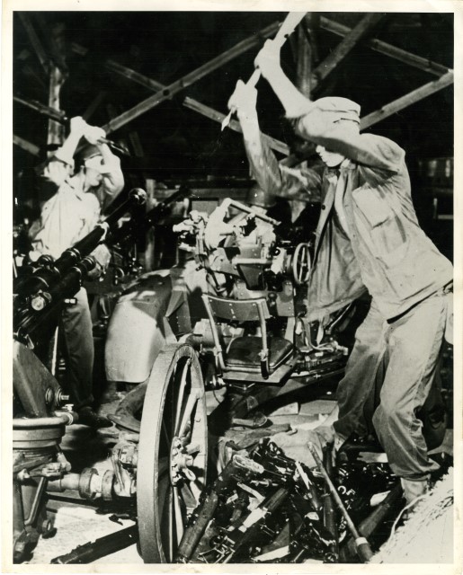 Due marinai americani distruggono le armi e le artiglierie giapponesi in una base conquistata nella città di Yokosuka.