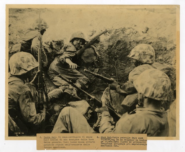 Militari americani sono nascosti all'interno di una buca, durante le battaglie svolte sull'isola di Namur.