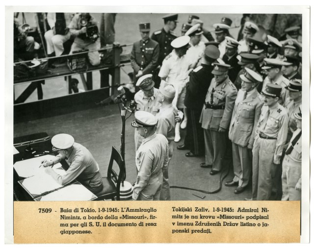 Sulla nave «Missouri», attraccata nella baia di Tokyo, il 01/09/1945, il comandante della Marina americana Chester W. Nimitz firma il documento della resa del Giappone.