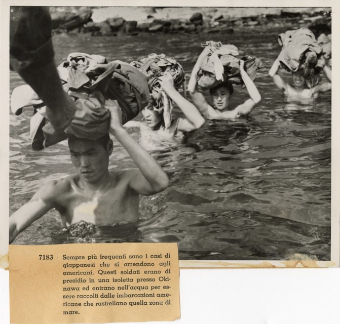 Alcuni militari giapponesi si arrendono agli americani: vengono raccolti dalle navi nelle acque di Okinawa.