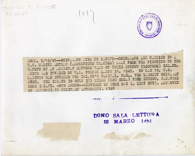 Marinai americani trasportano alcune donne e bambini di Okinawa verso un campo profughi americano lontano dalla guerra.