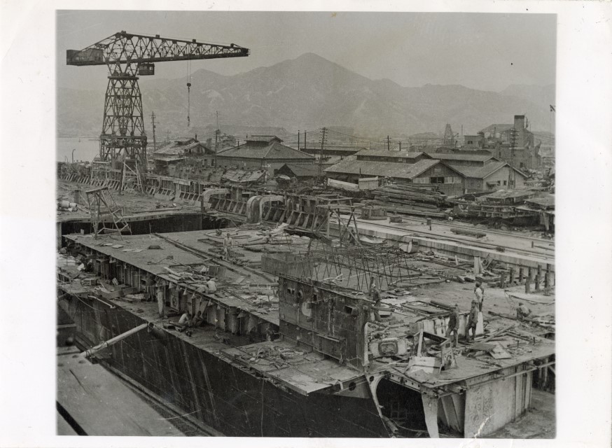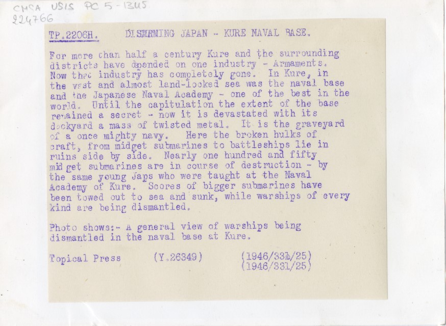 Veduta d'insieme della base navale di Kure, una delle più importanti e grandi del Giappone e sede dell'Accademia navale. La foto mostra il disfacimento in cui è caduta dopo la resa del Giappone.