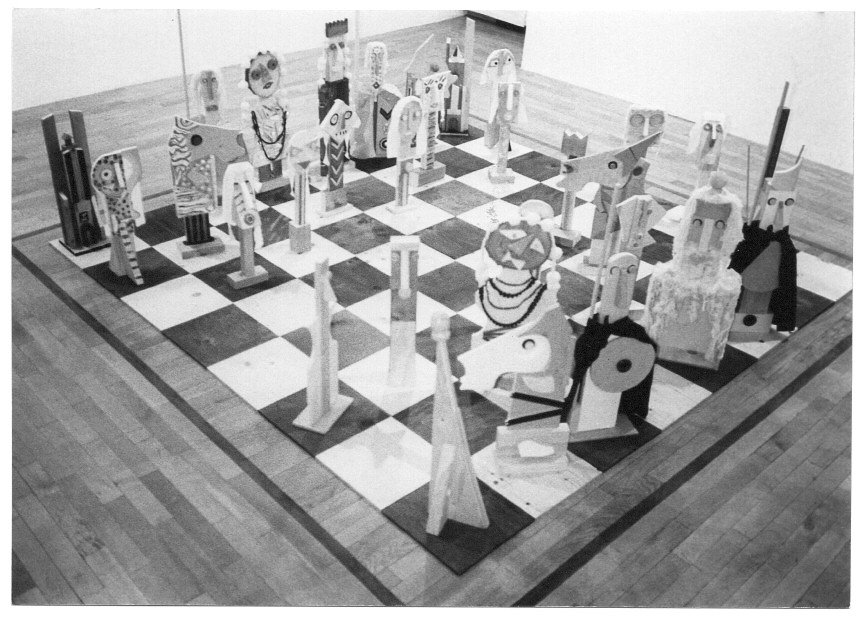Gli Scacchi di Baj, realizzati nel 1988, sono un multiplo, ufficialmente con una tiratura di 30 esemplari (in realtà ne sono stati realizzati 15) + cinque contraddistinti da numeri romani da I a V. Dimensioni: altezza media dei pezzi cm 75; Scacchiera cm 272 x 272 composta da 64 caselle di cm 34 x 34; Pedana scacchiera cm 282 x 282 altezza cm 34.
