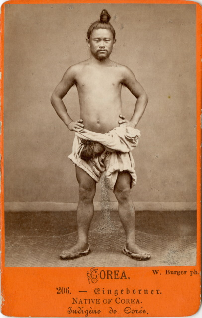 Il fotografo viennese Burger (1844-1920) partecipa in veste di fotografo ufficiale, nel 1868, a una spedizione diplomatico commerciale che gli consente di visitare il Siam, la Cina e il Giappone.Tornerà a Vienna solo nel 1870. Il positivo immortala un coreano seminudo ritratto durante il soggiorno nel Paese del Sol Levante: si tratta di un tipico esempio di ritratto etnografico che ha larga diffusione negli album ottocenteschi, un genere che contribuisce alla diffusione della moda dell’esotismo e che consente di conoscere l’altro, il diverso. La carte de visite (chiamata in giapponese tefuda, lett. carta a mano) rientra nell’ambito della serie di grande successo dei tipi nativi che mirano a rappresentare i soggetti più caratteristici e immediatamente riconoscibili come i venditori ambulanti, i bambini, le geisha, gli attori di teatro, gli artisti di strada, i pompieri e i samurai. I più famosi tipi nativi sono realizzati dal grande fotografo veneziano Felice Beato (1832-1909) che ha il merito di avere esaltato il potenziale archetipo dell’immagine etnografica, come sostiene la studiosa Carmen Cabrejas Almena. Si tratta di immagini che manifestano attributi inconsueti e straordinari e che, declinando i codici più esuberanti dell’esotismo, suscitano curiosità, fascino e talvolta orrore. Se alcune scene sono eseguite all’esterno, molti ritratti sono realizzati in studio. È il caso del ritratto a figura intera dell’indigeno coreano, dal fiero cipiglio, a torso nudo ma con le scarpe, dai lunghi capelli neri raccolti in uno chignon. Da un confronto con l’esemplare posseduto dal Museo d’arti applicate di Vienna si è desunto il luogo di ripresa. Il positivo è stato realizzato a Nagasaki, presumibilmente nello studio di Ueno Hikoma (18381904) al n 5 di Nakashima. La foto riveste un particolare interesse, non solo perché si tratta di una delle rare testimonianze coreane presenti in Fototeca, ma anche perché il fotografo non è riuscito a eliminare completamente le tracce del sostegno utilizzato per mantenere la posizione eretta. I tempi e modi di posa, piuttosto lunghi e rigidi, obbligavano a utilizzare questi strumenti d’appoggio che poi venivano cancellati. Sul supporto in cartoncino è riportato il paese di provenienza del personaggio ritratto, il nome del fotografo, il numero identificativo e un breve titolo dell’opera in tedesco, inglese e francese, ciascuno con un carattere tipografico diverso. Burger affronta la spedizione in Oriente con una fotocamera da viaggio, strumento semplice, formato da una cassetta di legno (generalmente di mogano o noce) sigillata e annerita internamente, detta “camera oscura”, su cui è anteriormente assicurato un obiettivo e posteriormente applicato un telaio con un cristallo smerigliato, per ricevere e mettere a fuoco l’immagine disegnata dall’obiettivo. L’apparecchio è solitamente completato da un astuccio che può essere collocato esattamente al posto del telaio. La misura delle fotocamere dipende dalla grandezza massima delle lastre. Le fotocamere da viaggio hanno soffietti pieghevoli che alleggeriscono l’apparecchio e permettono di regolare la lunghezza della camera oscura. Il fotografo parte dalla capitale asburgica portando con sé alcune lastre al collodio secco al tannino che consente di conservare le lastre a lungo. Testo tratto da Claudia Colecchia "Dietro le quinte di Palazzo Gopcevich", p. 158