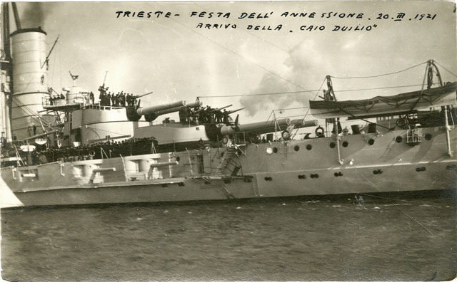 Arrivo della nave Caio Duilio/" in occasione delle celebrazioni per l'annessione di Trieste all'Italia."