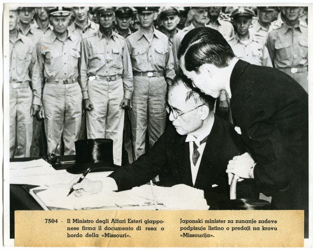 Il Ministro degli Affari Esteri giapponese Mamoru Shigemitsu firma i documenti di resa del Giappone nel settembre 1945.