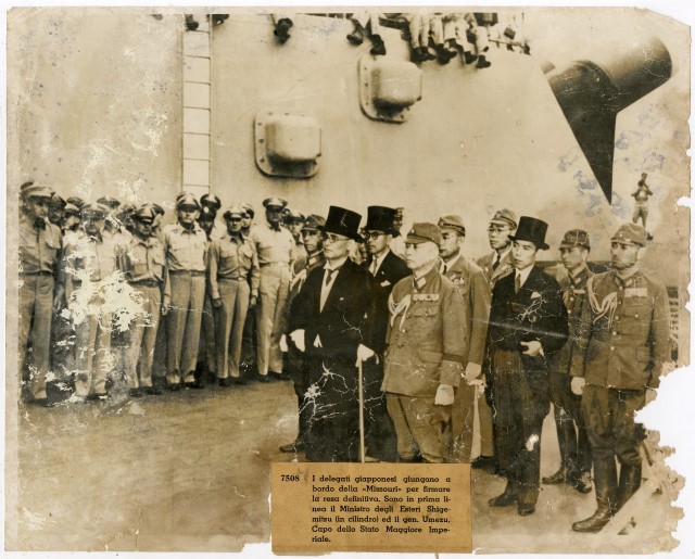 La delegazione giapponese, guidata dal Ministro degli Affari Esteri Mamoru Shigemitsu e dal Generale Yoshijirō si trova sul ponte della nave americana Missouri per firmare la resa del Paese nel settembre 1945.