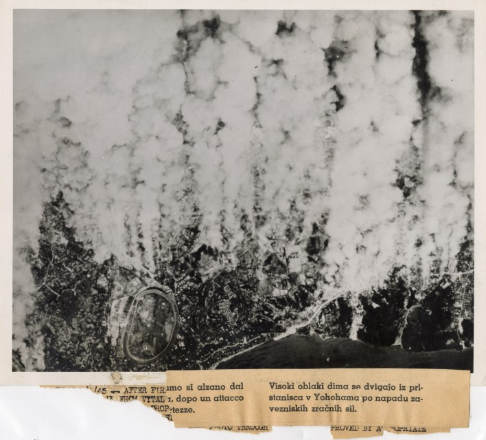 Veduta aerea di un attacco delle superfortezze americane sulla città di Yokohama.