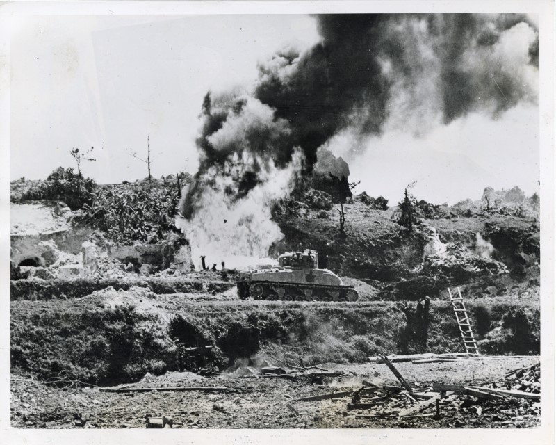 Un carro armato lanciafiamme americano attacca una posizione giapponese sull'isola di Okinawa.