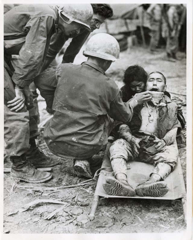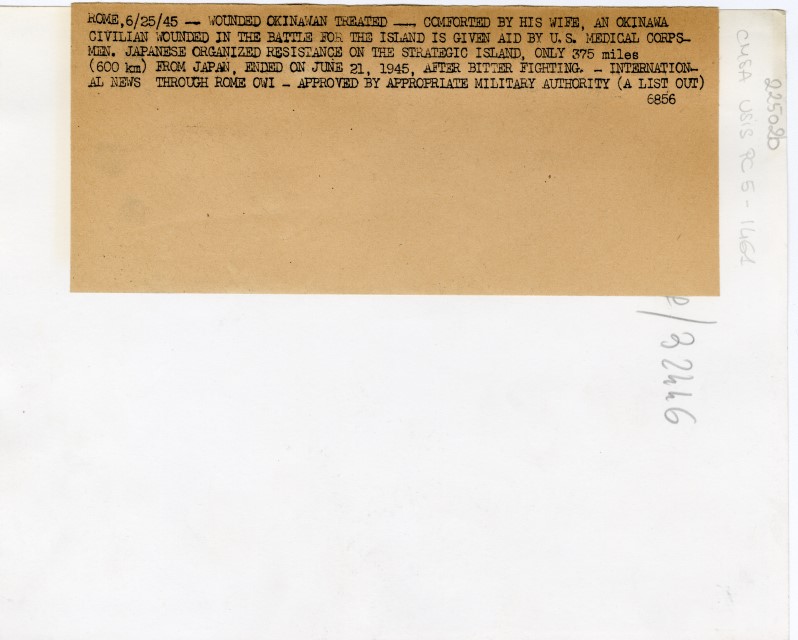 Un abitante di Okinawa ferito viene curato dai medici americani.