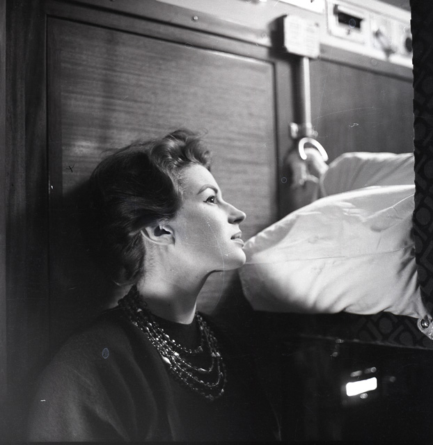 Ugo Borsatti corre in stazione a mezzanotte per immortalare Silvana Mangano (Roma, 1930-Madrid, 1989) nella carrozza letto del treno diretto a Belgrado. L’attrice deve concludere le riprese del film "La tempesta", ed è accompagnata dal marito Dino De Laurentiis (Torre Annunziata, 1919-Beverly Hills, 2010), dal regista Alberto Lattuada (Vapro d’Adda, 1914-Roma, 2005), dalle triestine Fulvia Franco (Trieste, 1931-Roma, 1988) e Anna Gruber (Trieste, 1929-2000). Il fotografo resta molto colpito dall’affabilità, dal modo di parlare della diva e dal suo profilo.