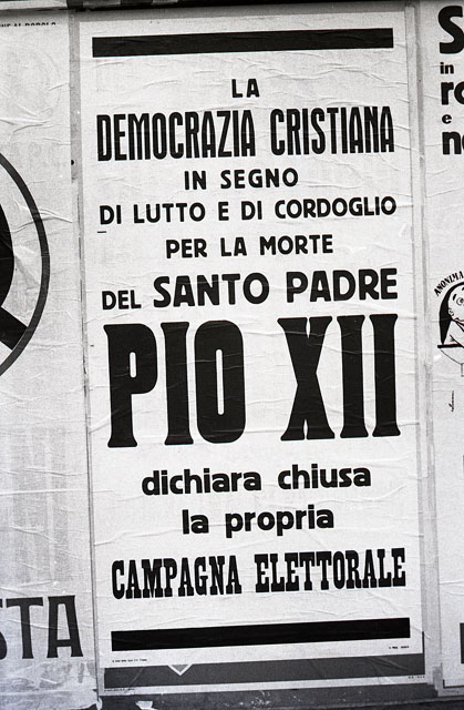 Appena appresa la notizia della scomparsa del Sommo Pontefice la Democrazia Cristiana dichiara chiusa con un comunicato la sua campagna elettorale invitando anche gli altri partiti a fare lo stesso