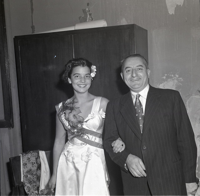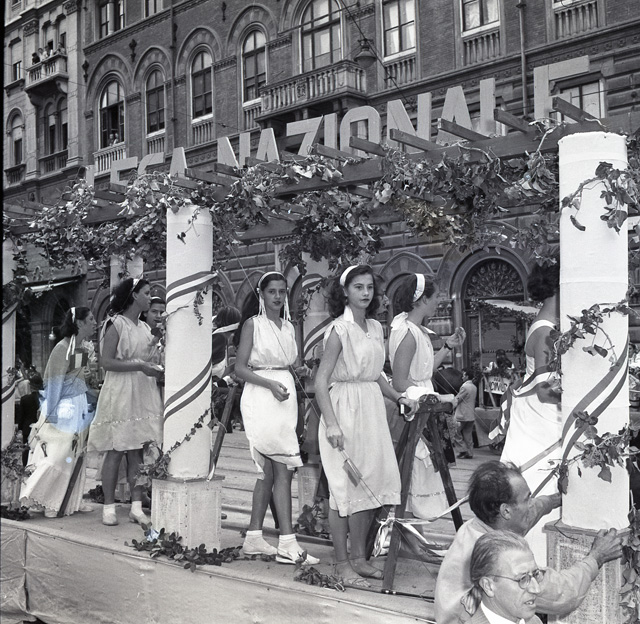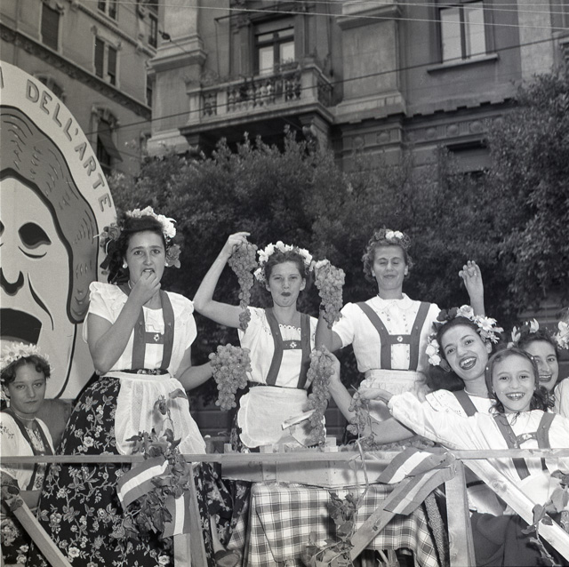 Sfilata di carri allegorici per le vie del centro; Ketty Burba, Miss Trieste 1951, in posa accanto ai grappoli; festa al castello di San Giusto.