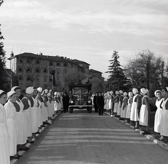 La salma del barone procede, accompagnata dalla folla, dall'ospedale Burlo-Garofolo per le vie della citta, fino alla chiesa greco ortodossa di San Nicolo per la celebrazione delle esequie.