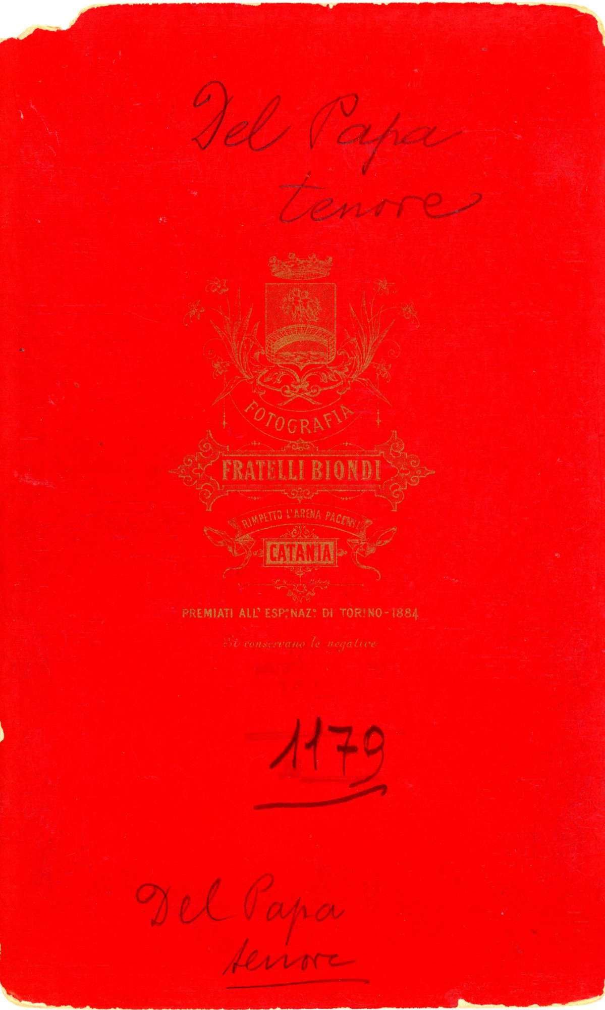 In costume. Il tenore ha cantato a Catania nel 1889, la fotografia può essere stata scattata allora. Al Politeama Rossetti di Trieste si è esibito nel 1887 in "La forza del destino", "Ernani" e "La favorita" e nel 1889 in "Carmen". Esordio nel 1878 a Pisa, emigra nel 1894 negli Stati Uniti, cantò alla Grand Opera House di New York in Cavalleria Rusticana, Carmen e Pagliacci. L'anno successivo fu all'Opera di Boston in Cavalleria Rusticana. Si esibì regolarmente almeno fino al 1903 accettando di ritornare sulla scena nel 1915 con un concerto alla Century Opera House di New York. Nel 1900 aperta a New York un a scuola di canto, si dedicò alla formazione di nuovi talenti.