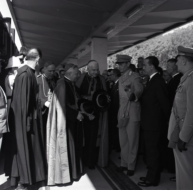 Il cardinale Lercaro, assistito dai monsignori Rovis e Dagri, benedice la pietra carsica durante il rito della sua consacrazione celebrata sul Monte Grisa, dove sorgerà il Tempio Mariano. Il cardinale Lercaro giunge a Trieste con il cardinale Urbani.