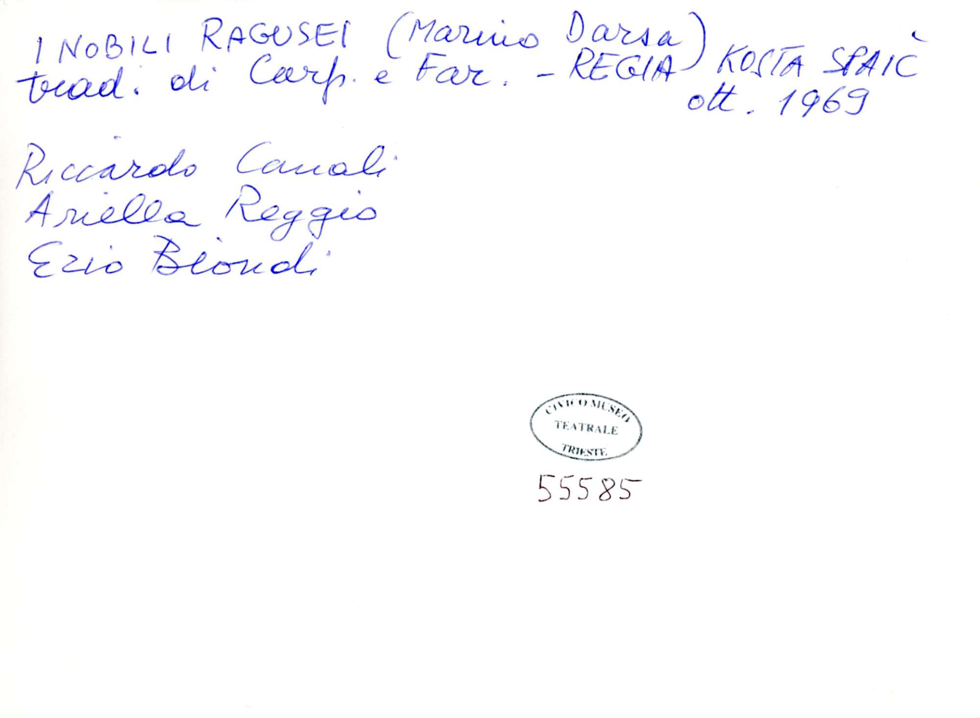 I nobili ragusei, di Marino Darsa, versione italiana di Lino Carpinteri e Mariano Faraguna, regia di Kosta Spaic, rappresentato al Politeama Rossetti dal 8 al 26 ottobre 1969