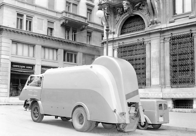 L'autocarro Bracchi Alessandri acquistato dall'amministrazione comunale prevede un nuovo sistema d'asporto delle immondizie. Lo scaricatore applica il bottino all'apposita apertura e il materiale viene aspirato.