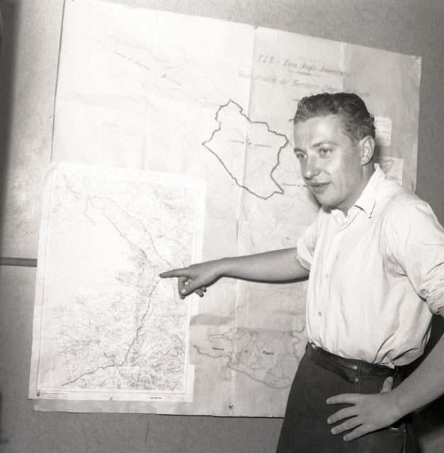 Ragazzo immortalato davanti a una mappa della zona occupata dal Governo militare alleato.