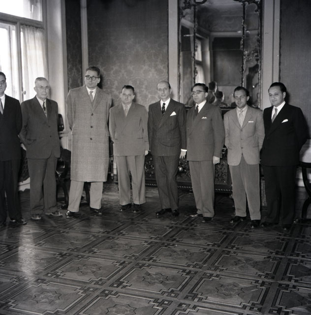 Gli allievi del Collegio di Pesaro per le vittime della guerra partecipano alla storica giornata del 26 ottobre e vengono ricevuti da Fracassi e dal sindaco Bertoli presso Villa Revoltella. Testo tratto da Il Piccolo: giornale di Trieste, 28.10.1954