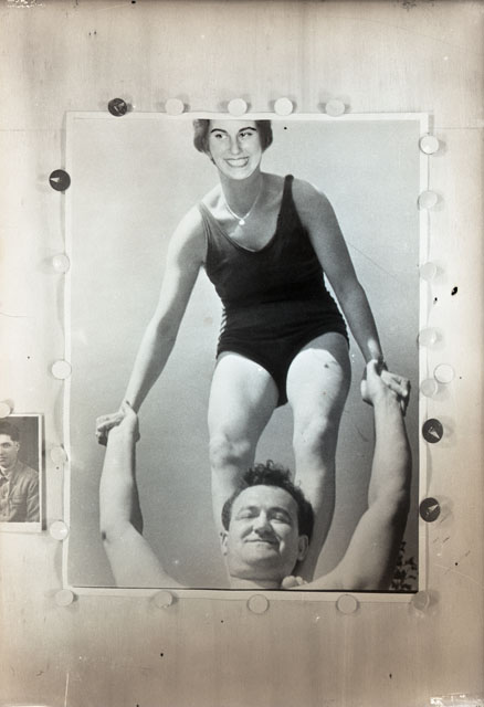 Donna in costume intero in equilibrio in piedi sulle spalle di un uomo che la sostiene