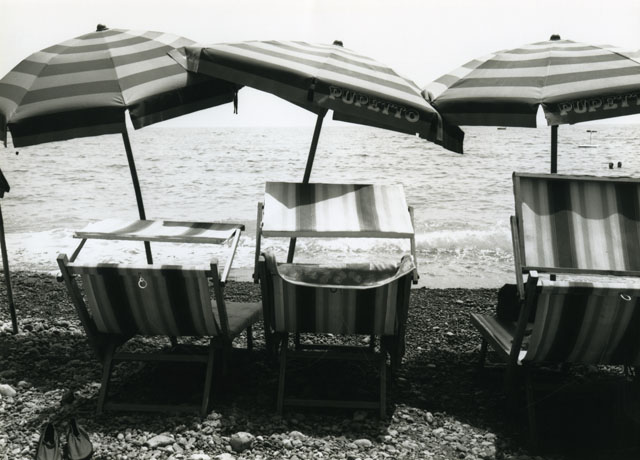 Veduta del mare con ombrelloni e sdraio