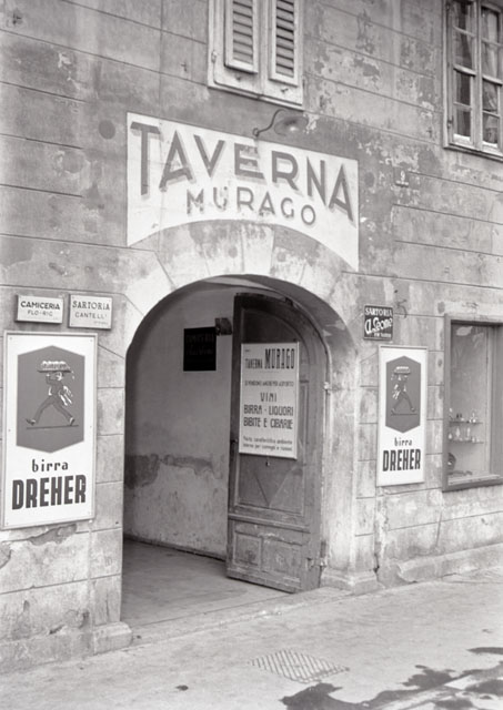 L'insegna della Taverna Murago che offre ai suoi clienti vini birra liquori bibite e cibarie, l'insegna pubblicitaria della birra Dreher e accanto le tabelle delle sartorie A.Leone, Cantelli e la camiceria FLO - RIG