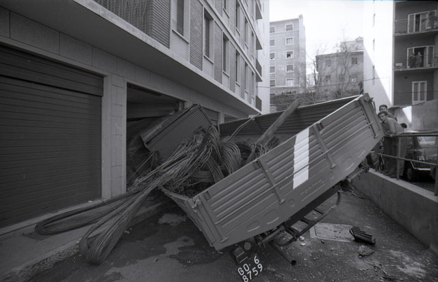 Scontro tra camion e varie auto (sfondata saracinesca)