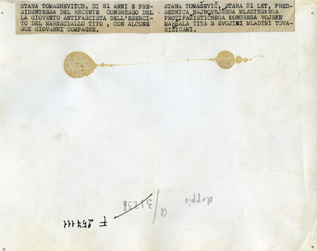 Stana Tomašević è stata la prima ambasciatrice della Jugoslavia in Norvegia, Islanda e Danimarca, presidente della Camera federale dal 1979 all'82. Nata in Montenegro nel 1920,ha lavorato come insegnante a Vrulja, vicino a Pljevja quando il Regno d'Italia ha occupato il Montenegro nel 1941. Si è unita immediatamente ai partigiani facendo parte del battaglione "Jovan Tomacevic" e poi nella Quarta Brigata Proletaria montenegrina. Nel maggio 1944, i tedeschi hanno tentato di catturare Josip Broz Tito nella città bosniaca di Drvar; il battaglione di Stana ha giocato un ruolo importante nella difesa di Tito. Mentre era a Drvar, il fotografo militare britannico John Talbot ha scattato delle foto di lei che sono state diffuse come volantini sull'Europa per incoraggiare la resistenza agli occupanti. Le foto si sono diffuse ampiamente tra i combattenti della resistenza europea. Suo fratello Duko è stato ucciso dai cetnici mentre combatteva in Bosnia. Dopo la guerra, si è laureata alla Facoltà di Filosofia di Belgrado nel 1954, e poi ha servito come ministro federale nel governo jugoslavo ed è stata la prima ambasciatrice donna del paese - in Norvegia e in Islanda (1963-1967) e in seguito Danimarca (1974-1978). In Norvegia, ha incontrato e sposato il regista Eugen Arnesen, morto nel 1969. E' morta di cancro nel 1983 a Belgrado, poco dopo essersi ritirata come presidente della Camera federale del Parlamento jugoslavo. Tratto da Wikipedia, ultima consultazione 26.06.2025