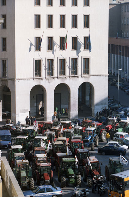 Protesta agricoltori '99, trattori, vigili, traffico bloccato, piazza Oberdan.