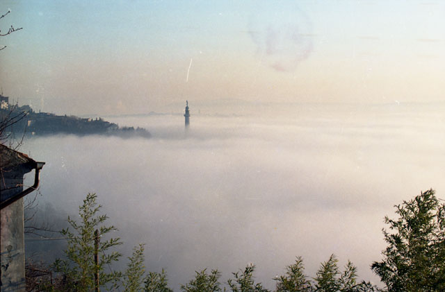 Codarin, Sluga, provincia risiera, foiba 25.04.1999. Faro della Vittoria con nebbia. Fassino in camera di commercio, Donaggio. Stazione dei treni,
