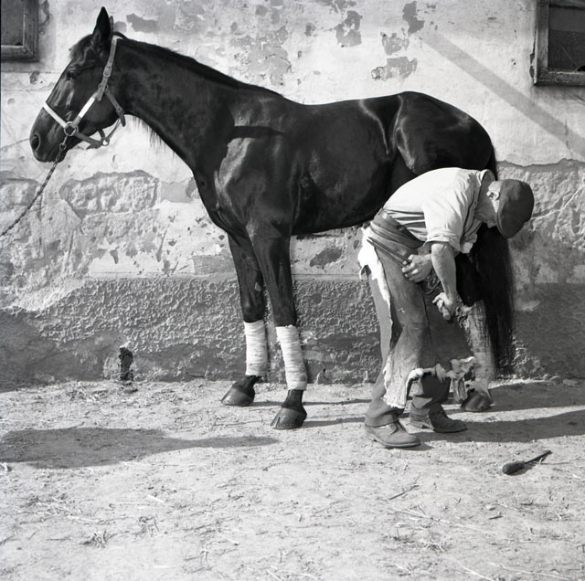 Un maniscalco intento a pareggiare o ferrare gli zoccoli di un cavallo