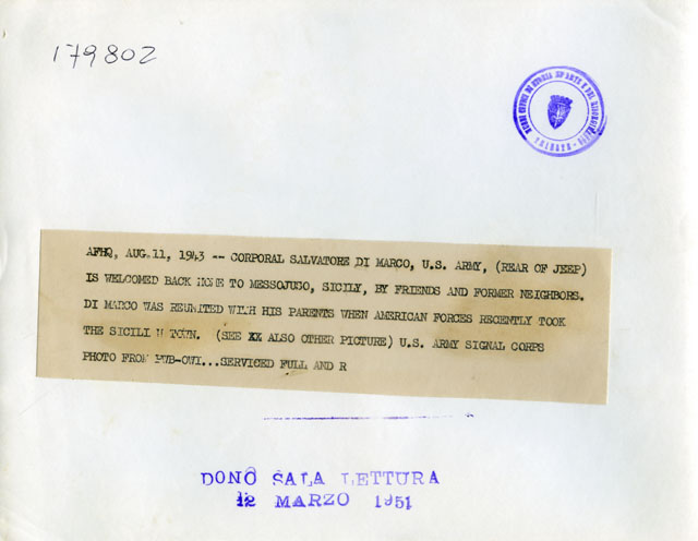 CORPORAL SALVATORE DI MARCO, U.S. ARMY, (REAR OF JEEP) IS WELCOMED BACK HOUSE TO MESSOJUSO, SICILY, BY FRIENDS AND FORMER NEIGHBORS.