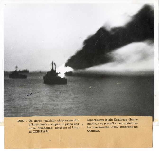 Una nave americana in fiamme dopo un attacco suicida da parte di un aereo giapponese nelle acque di Okinawa.