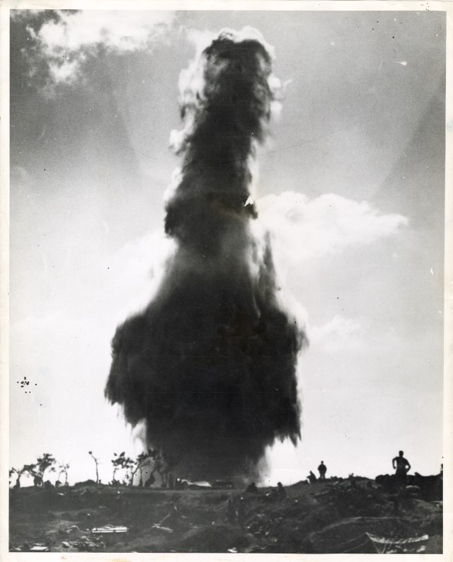 Incendio di un impianto petrolifero giapponese sull'isola di Okinawa nel marzo del 1945.