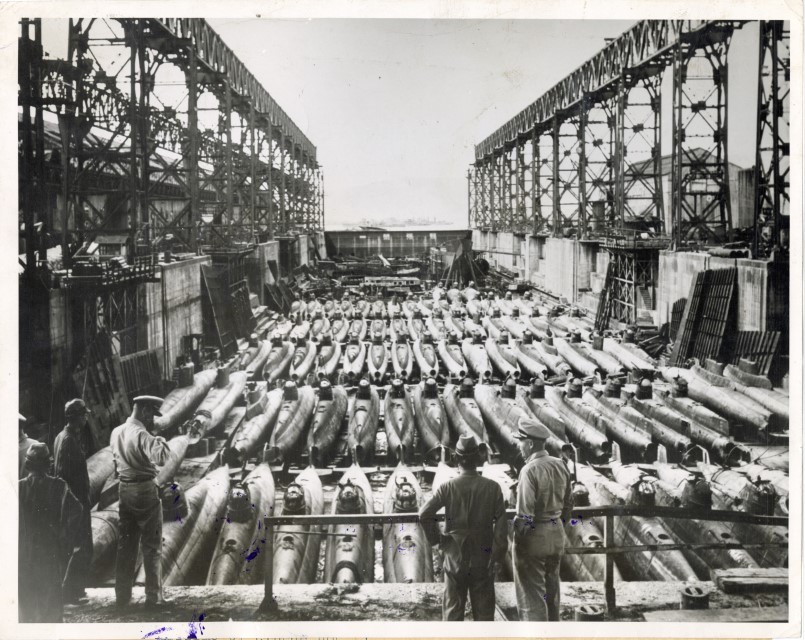 Alcuni Ufficiali della Marina americana ispezionano la conquistata base navale di Kure, sull'isola di Honshu.