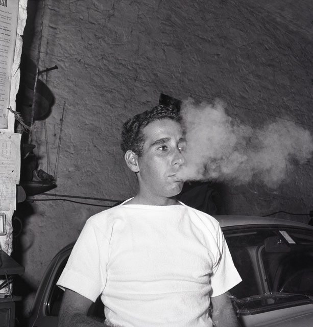 Cartello con divieto di fumo disatteso dalla presenza di un meccanico fumatore.