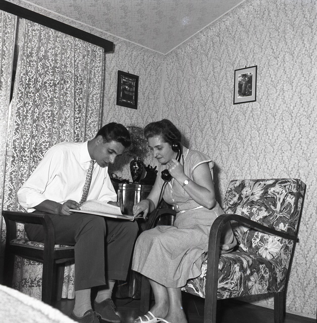 Madre e figlio ritratti in salotto vicino al radio e giradischi o mentre telefonano consultando la guida telefonica