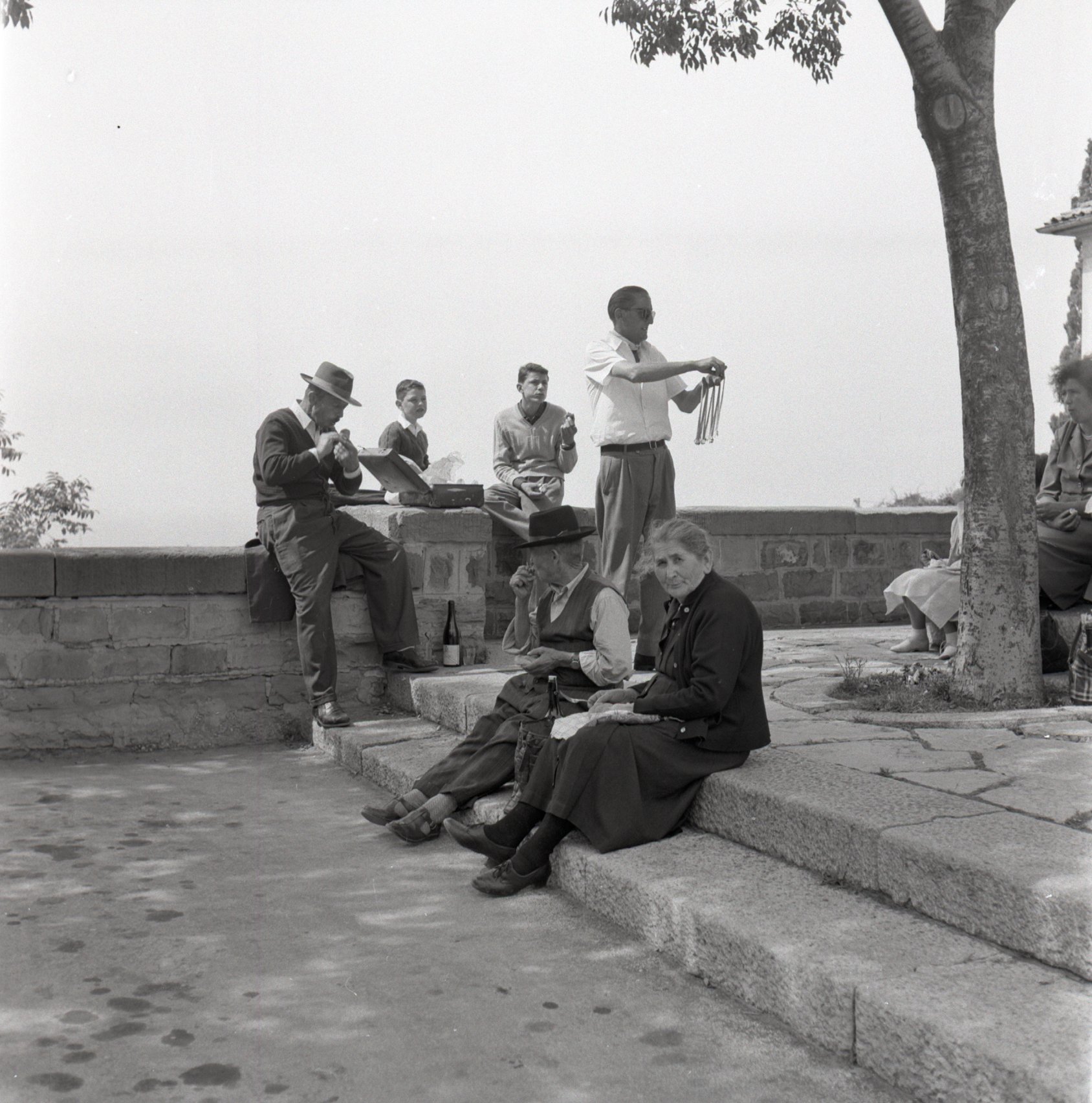 Bagnanti in scogliera; vedute di S. Giusto e fotografo; cassettista; turisti (anche sulle rive)