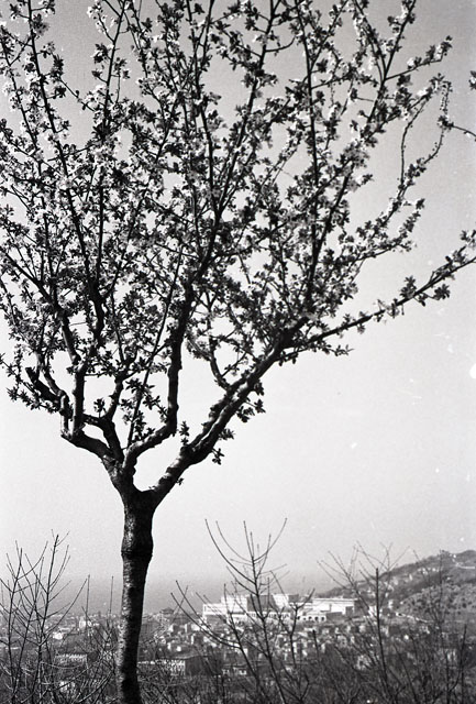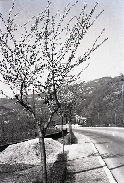 alberi in fiore in via F. Severo (presso curva Faccanoni) con vedute verso la città