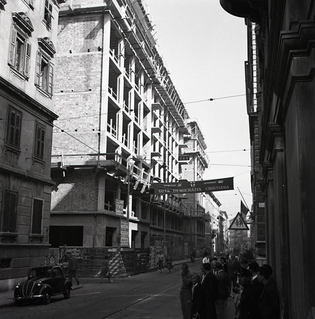 Dalla strada si vede uno striscione che invita a votare Democrazia Cristiana