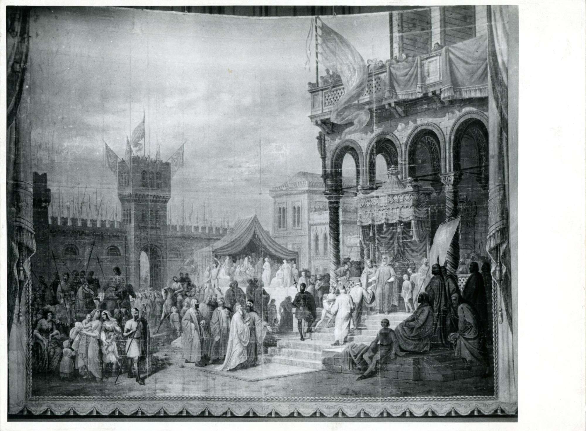 Sipario del Teatro Grande, realizzato dal pittore Vincenzo Giacomelli in collaborazione con lo scenografo Bertoia. Il soggetto rappresenta l'affrancamento del Comune dai diritti di governo che vi esercitavano i vescovi, la scena rappresenta il momento solenne in cui i diritti di giudizio e di governo vengono trasmessi al Podestà da due ufficiali della Camera Episcopale. Inaugurato nel 1846 fu in uso fino al 1882