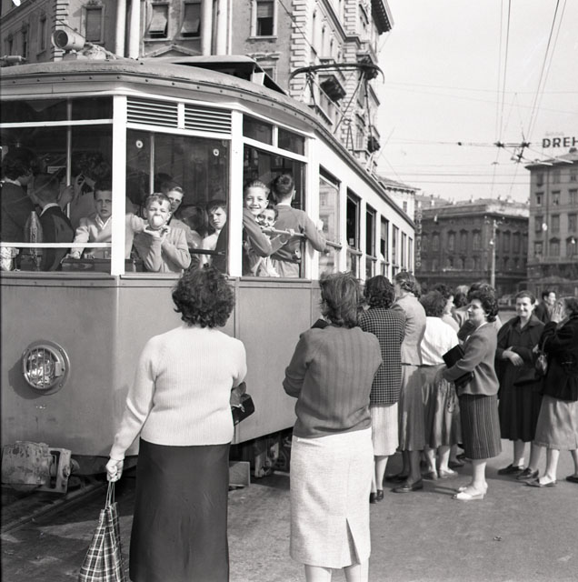 I bambini in Piazza Oberdan prendono il Tram che salendo per Via Cologna arriva ad Opicina