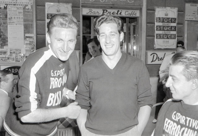 Gli atleti del gruppo sportivo Ferro-China Bisleri davanti al Bar Preti e all'emporio dell'automobile Goretti & Gervasi